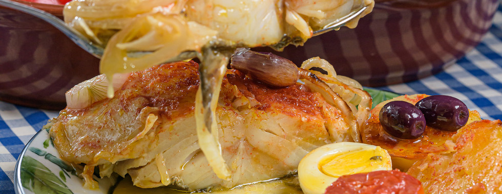 O Bacalhau ao Forno é uma representação fiel da culinária lusitana. Este prato robusto é servido com batatas e cebolas assadas, azeitonas pretas e um generoso rego de azeite português.